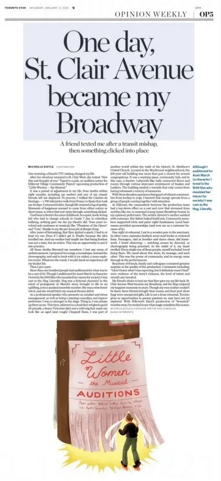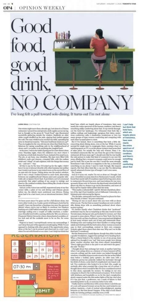 Cover and spot illustrations for the Toronto Star’s Opinion Weekly, for a piece on dining alone, and one spot for a piece about community theater.